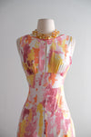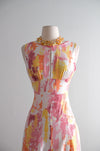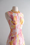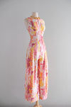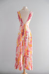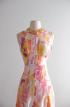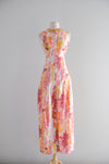 This striking 1970s jumpsuit from Fashion Wagon features a vibrant sorbet paint splatter design, perfect as vintage lounge attire. It’s a sleeveless piece with a keyhole neckline and an open back secured by a waist tie, designed to flatter a petite frame. The wide-leg pants add to its relaxed, stylish silhouette. Recently cleaned and prepared for immediate wear.