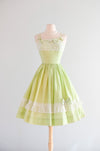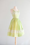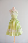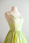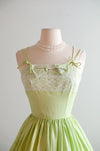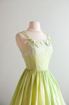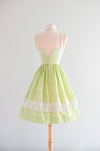 Sweetest 1950's lime green and ivory lace dress by Norma Gini. Fit & flare style cotton dress in lime green and ivory compete with lace details along the bust and in the skirt. Thin double straps the tie in the front. Zips in the back. Freshly cleaned and ready to wear!