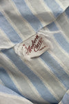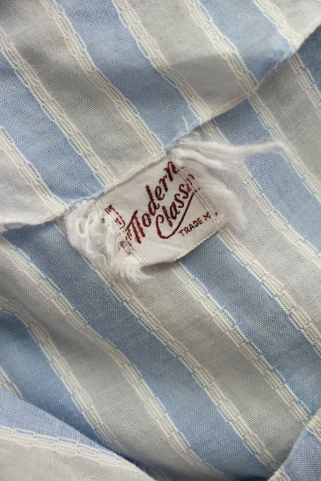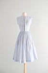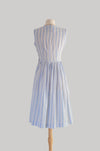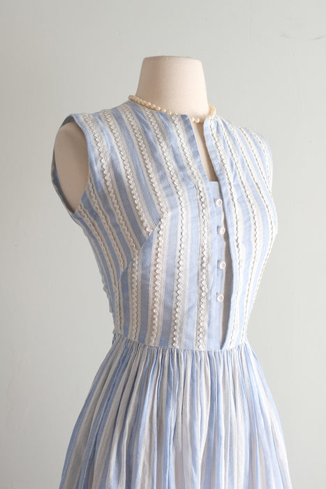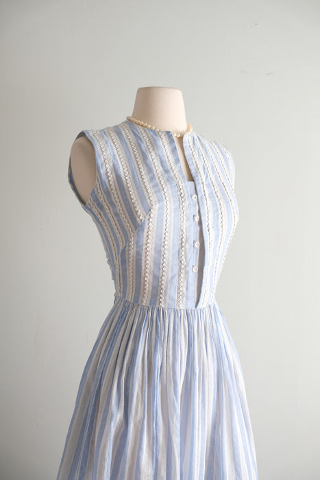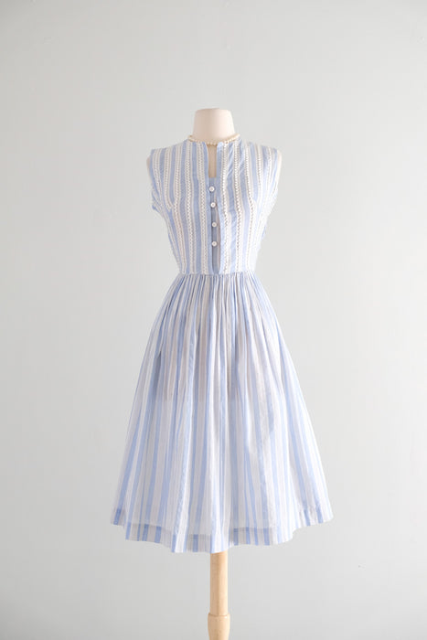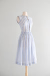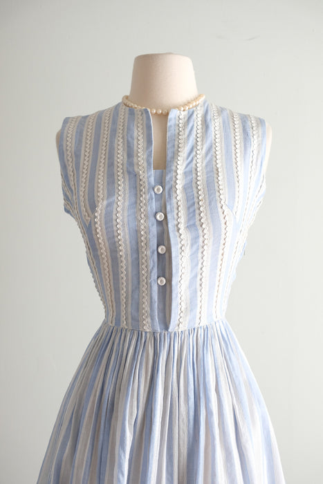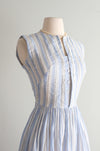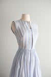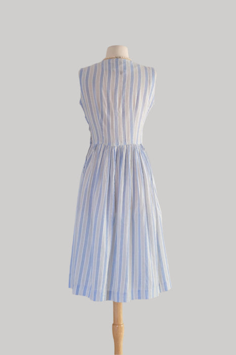 Adorable 1950's powder blue striped dress by Modern Classics. Light and airy, blue and ivory striped cotton fabric. Sleeveless fit and flare style dress with front panel adorned with false buttons that clasps on the inside. Metal zipper along the side. Freshly cleaned and ready to wear!