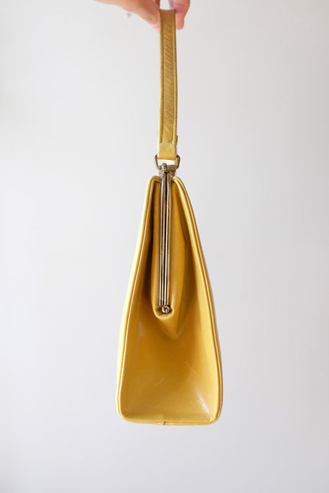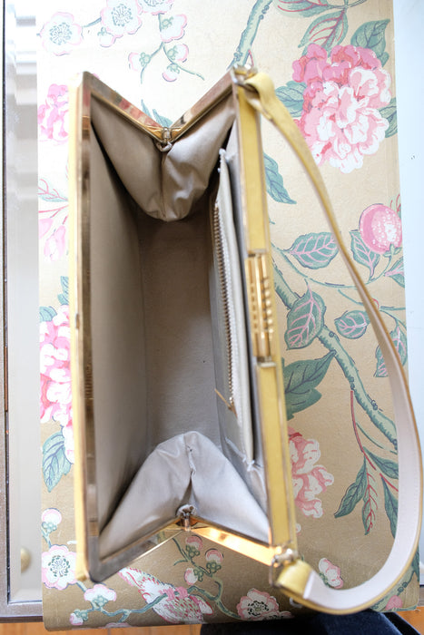 Fabulous 1960's yellow leather handbag. Vinyl interior lining. Single strap. Gold metal hardware with snap closure at the top. One inside pocket. Ready to wear!