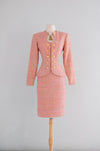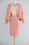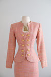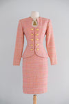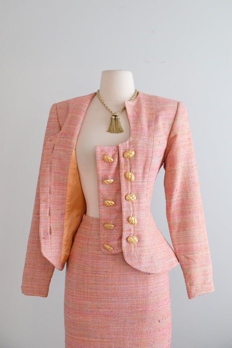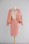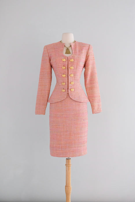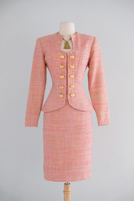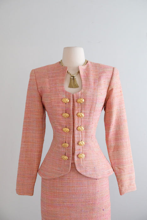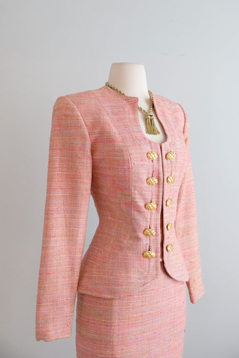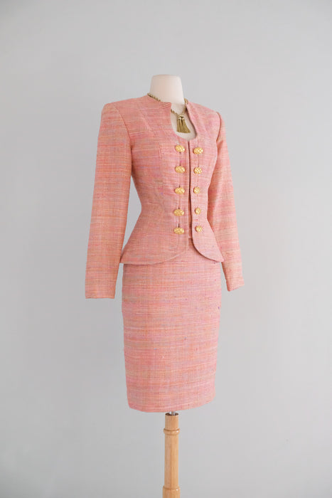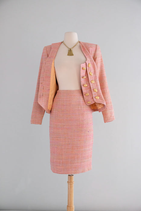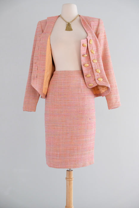 Stunning late 1980's pastel pink rainbow knit suit by Linda Segal. 100% silk knit appears a soft pink from a distance but reveals a whole rainbow variety of colors up close. Sculptural fitted jacket with double breasted statement gold button in the front. Matching high waisted pencil skirt, zips in the back. Freshly cleaned and ready to wear!