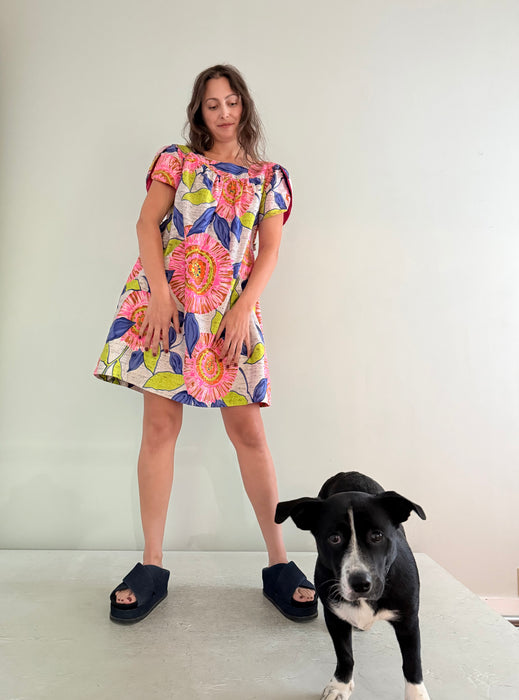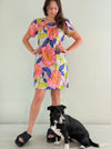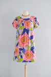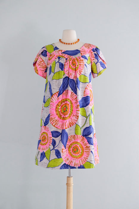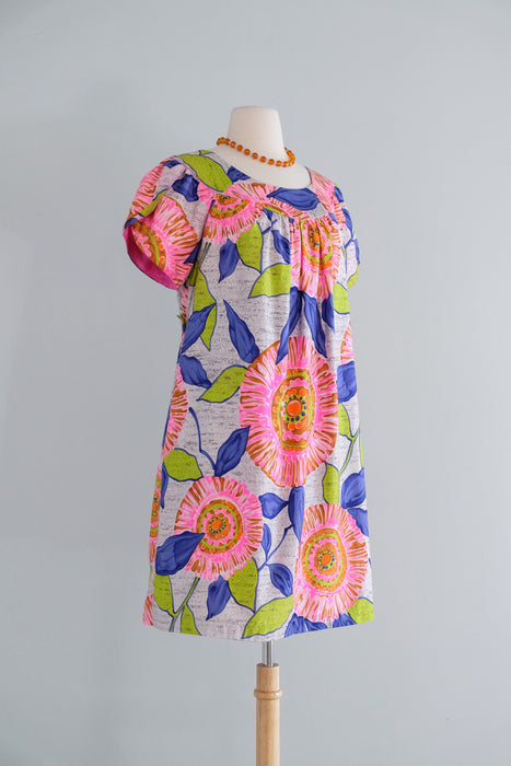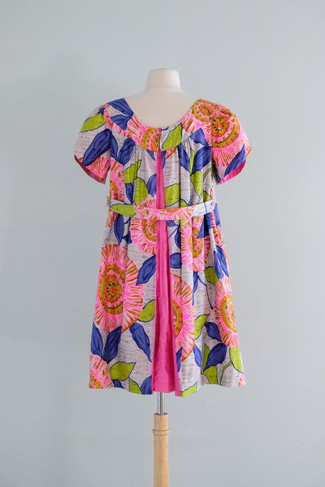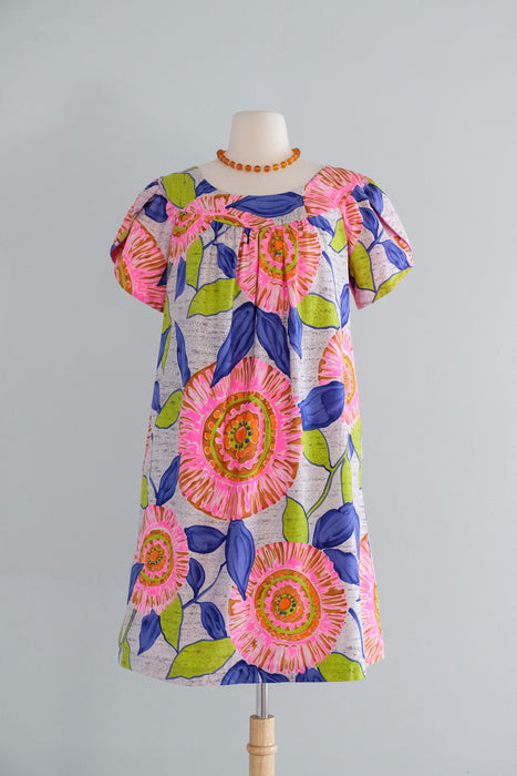 Striking 1960's floral printed Hawaiian dress. Trapeze style dress with short, overlapping petal sleeves and one pocket. Polished cotton material in a hot pink, green, and blue Passion flower print. Scott neckline. Waist belt in the back and zips in the back. Freshly cleaned and ready to wear!