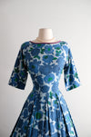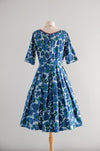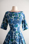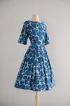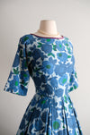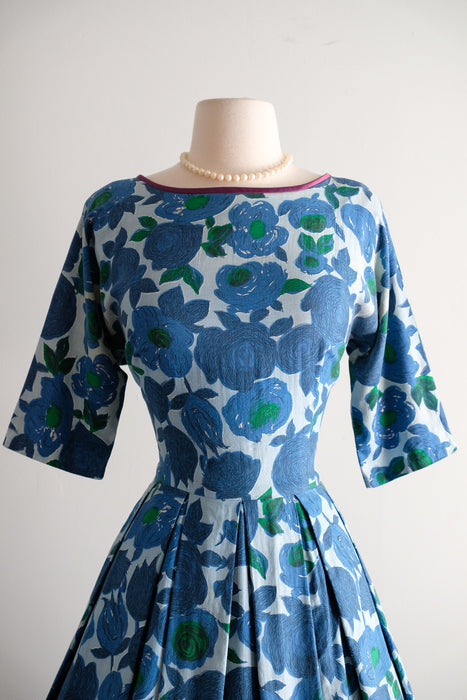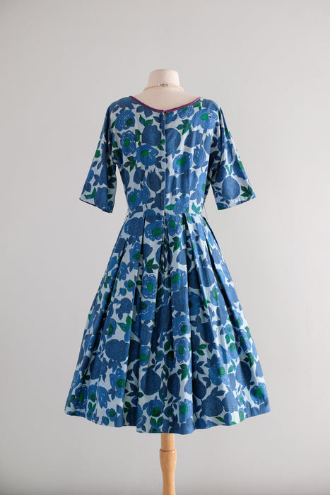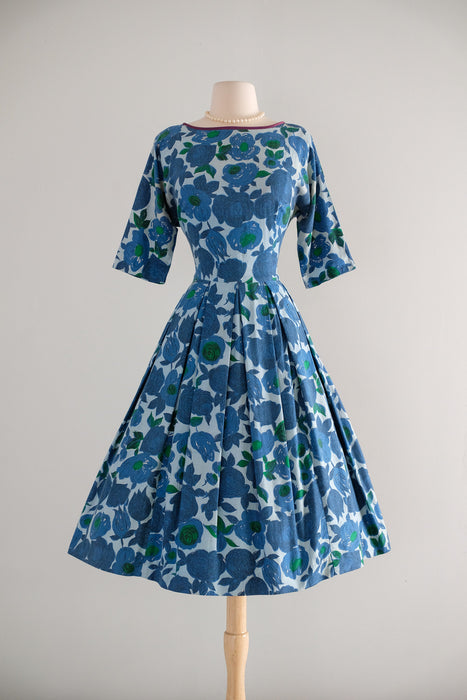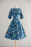 Gorgeous 1950's blue rose printed party dress. Amazing two toned blue rose print with green accents. Fit and flare style dress with 3/4 length sleeves and box pleated skirt. Metal zipper up the back. Freshly cleaned and ready to wear!