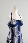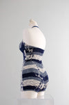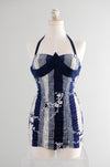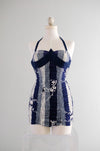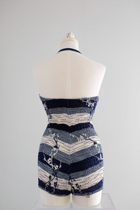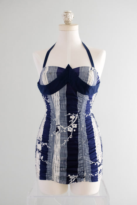 Incredible 1950's navy blue and white cotton swimsuit. Vertical striped print with cherry blossoms. Shirring in the the back with lots of stretch! Sweetheart neckline with halter straps. Strap is adjustable and buttons inside the neckline. Freshly cleaned and ready to wear!