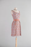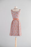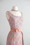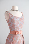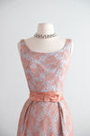 This charming early 1960s party dress by Junior Theme features baby blue and toffee pink lace in a sleeveless design with a scoop neckline. It is tailored at the waist with a satin band adorned by a central bow and detailed with side pleats on the skirt. The dress closes with a metal zipper at the back. Professionally cleaned and prepared for immediate wear.