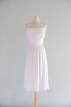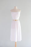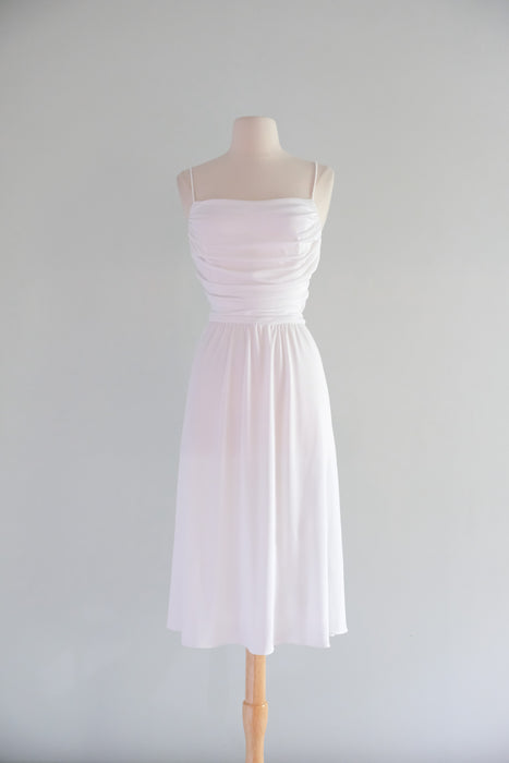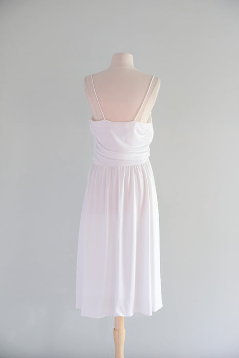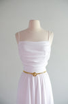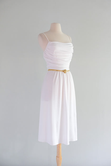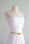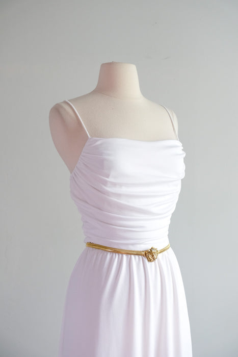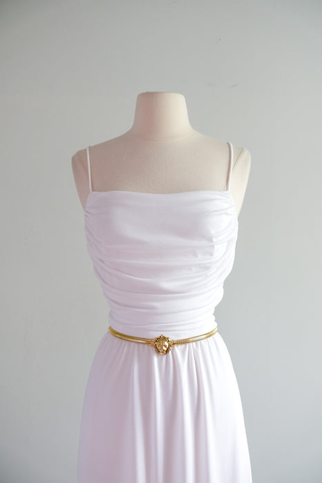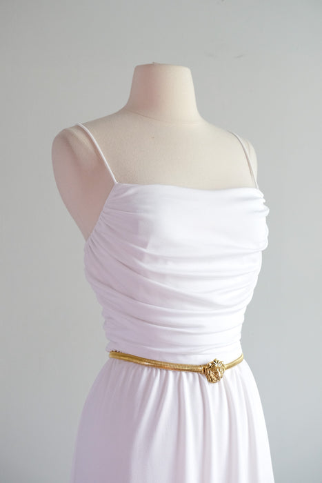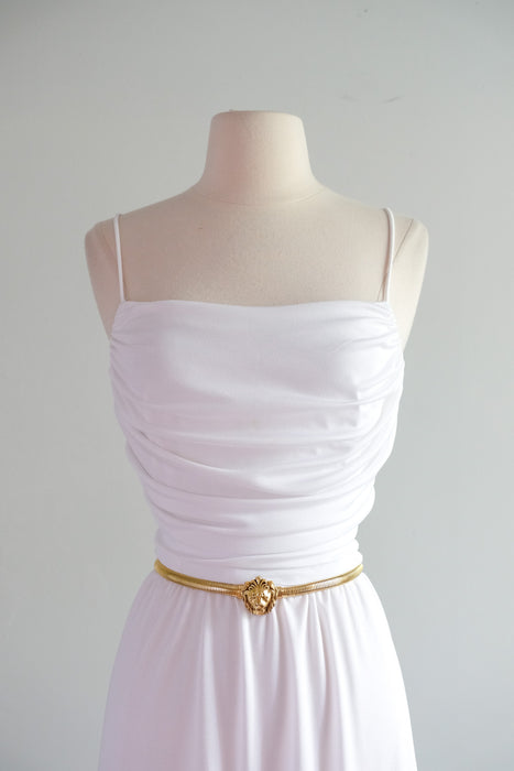 Angelic 1970’s white nylon jersey dress by Visionz. Draped across the front. Thin straps. Zips up the side. Fitted at the waist, flowing skirt. Styled with a fabulous gold toned lion belt. Freshly cleaned and ready to wear!