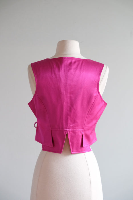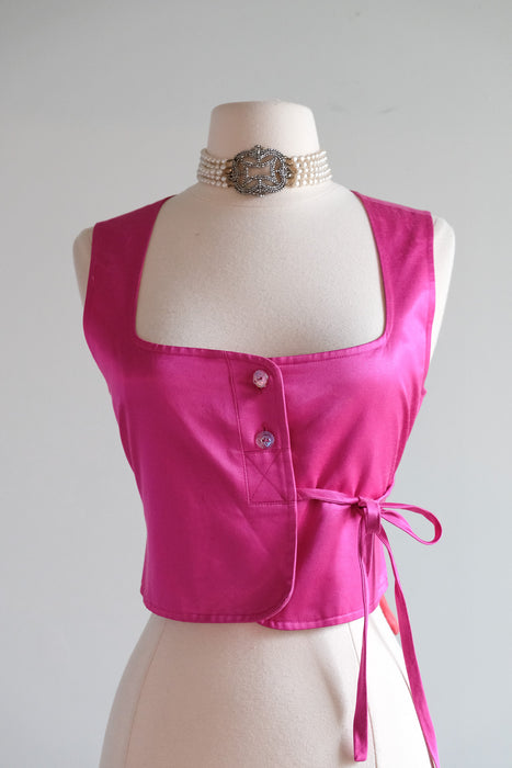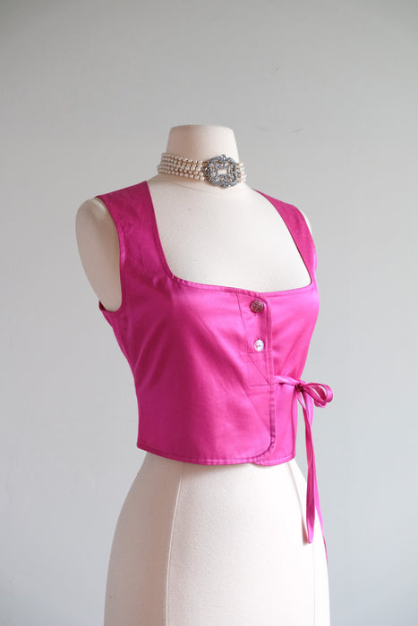 Rare vintage 1990's hot pink sleeveless blouse by Christian Lacroix. Vibrant pink cotton blouse with satin like sheen. Buttons in the front with unique tie to the side. Square neckline. Vest style tailoring in the back. Ready to wear!