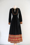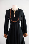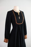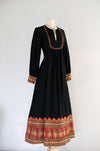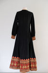 This 1970s block print cotton maxi dress from India, crafted by Shopping International, features a rich autumnal palette. The black long-sleeve design is detailed with intricately adorned cuffs and skirt hem. It includes a side zipper at the waist for a comfortable fit. Professionally cleaned and prepared for immediate wear.
