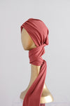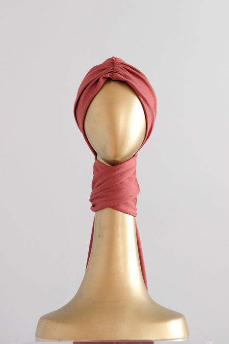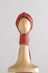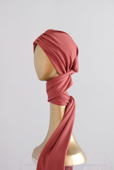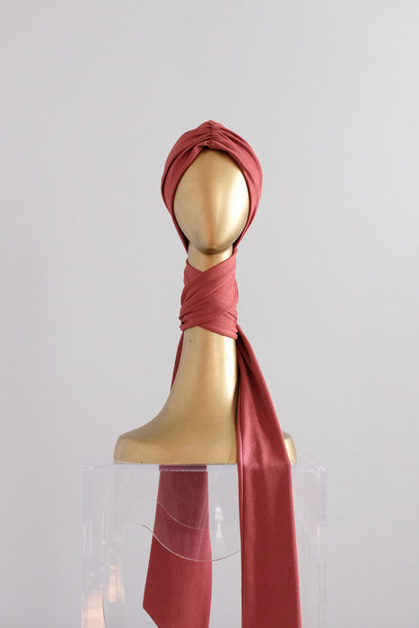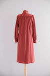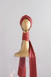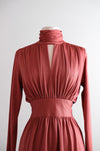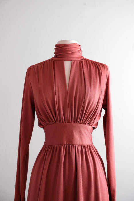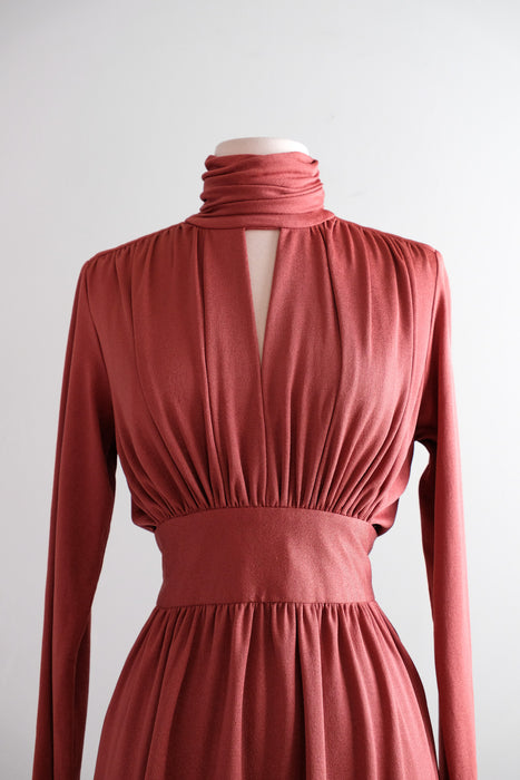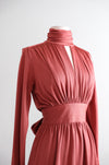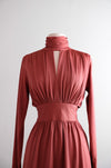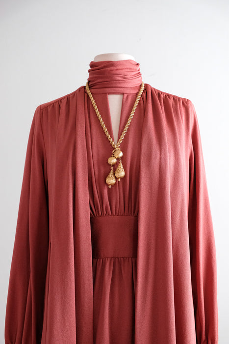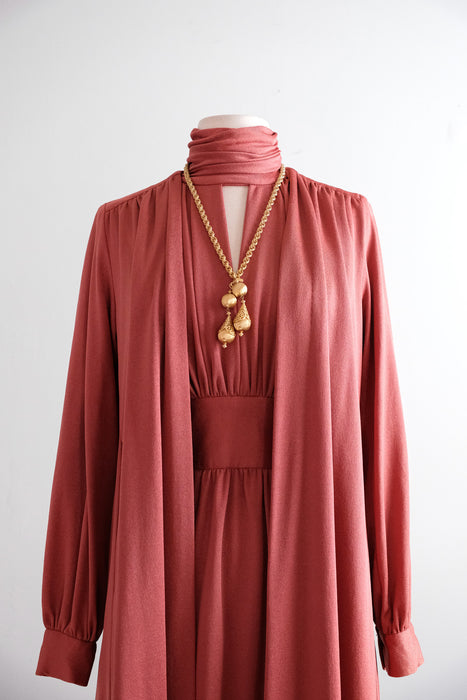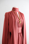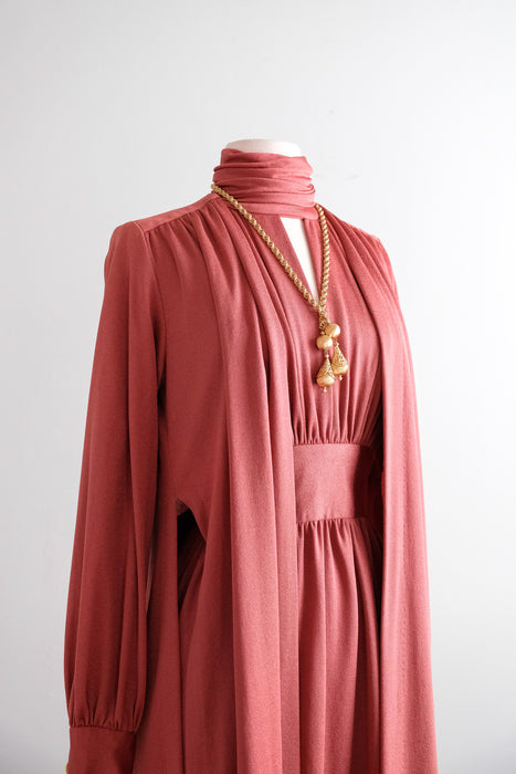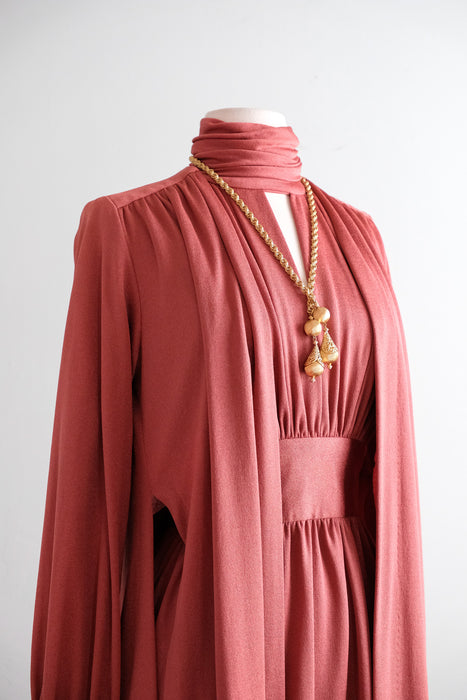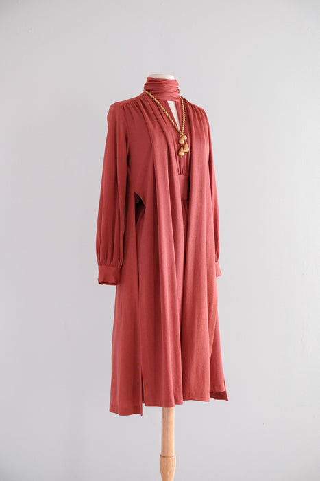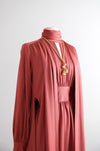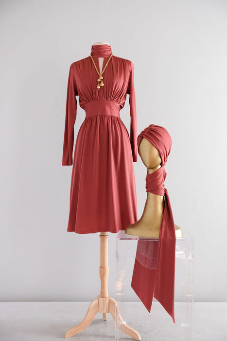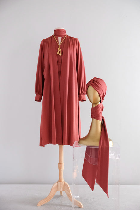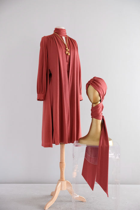 Epic 1970's three piece ensemble by Joy Stevens. Featuring a long sleeve dress, overcoat, and head piece, all in Sedona red. Dress is has long sleeves that gather at the cuffs. Fitted at the waistband and ties in the back. Zips in the back. Overcoat is open with slits along the sides. Turban style cape is fitted to the head and has two tails that can be worn hanging or wrapped around the neck. Freshly cleaned and ready to wear!
