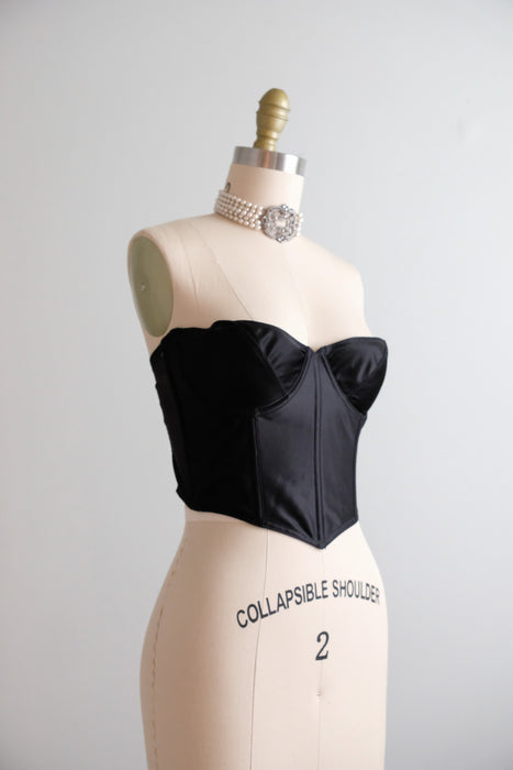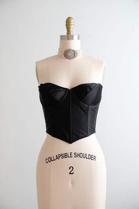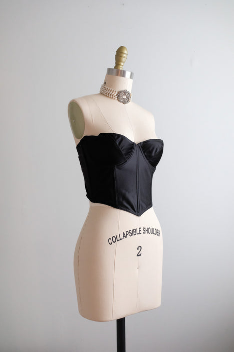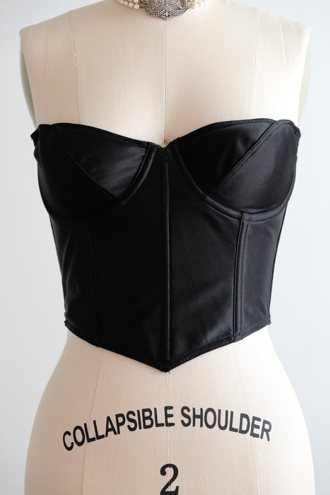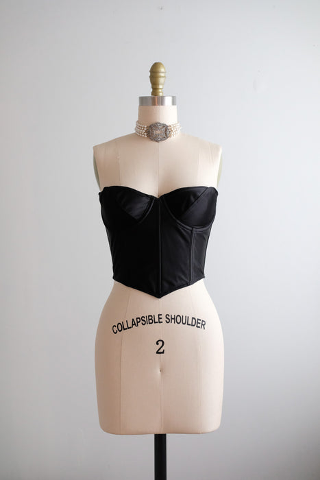 Sexy 1980's black strapless bustier top. Black nylon fabric, comfortable and stretchy with a slight sheen. Demi style bra cups, no padding. Adjustable clasps in the back. Freshly cleaned and ready to wear!