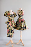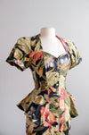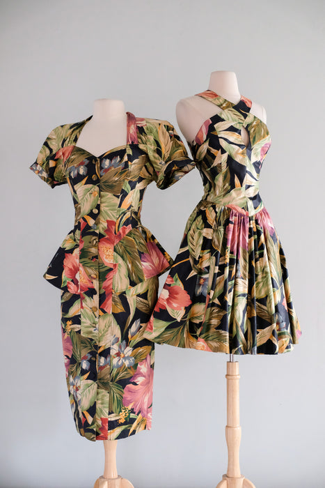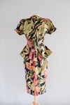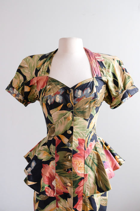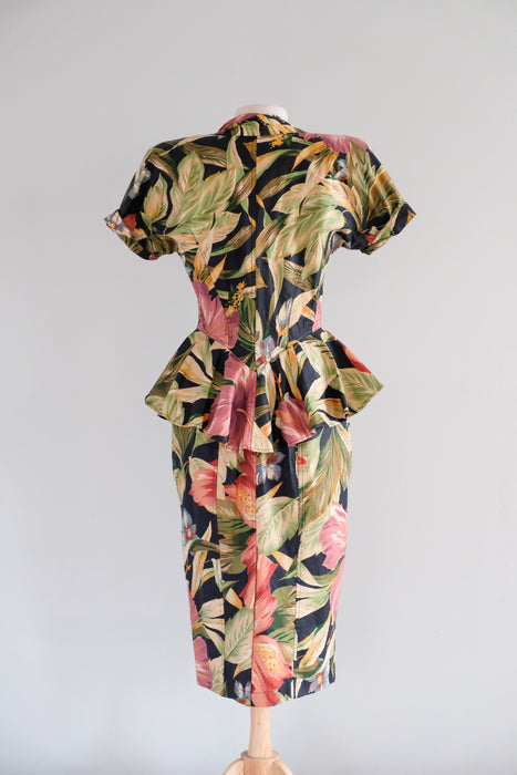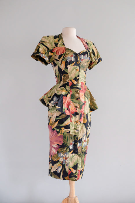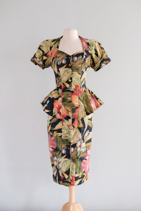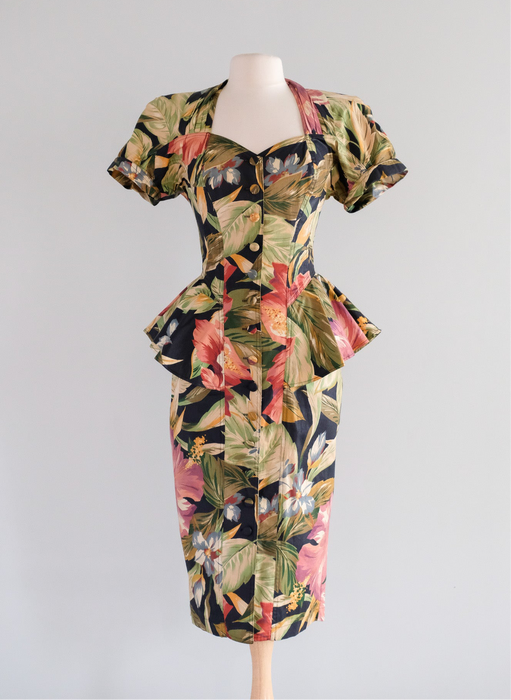 Fabulous 1980's tropical paradise floral printed cotton dress by Karen Alexander. Black base with green and pink lush tropical garden print. Fitted wiggle style with peplum at the hips. Buttons down the front. Sweetheart neckline and short sleeves. Removable padding in the shoulders. Freshly cleaned and ready to wear!