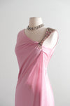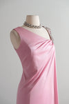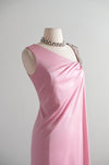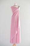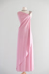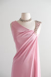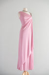 This exquisite 1970s evening gown exemplifies the era's sophisticated glamour with its flowing silhouette and refined details. The dusty rose nylon jersey fabric drapes beautifully in a Grecian-inspired design, while a single silver beaded strap adds an unexpected touch of elegance to the sleeveless, off-shoulder style neckline. A side zip closure ensures effortless dressing. Freshly cleaned and impeccably maintained, this vintage piece is ready to make a striking impression at any formal occasion.