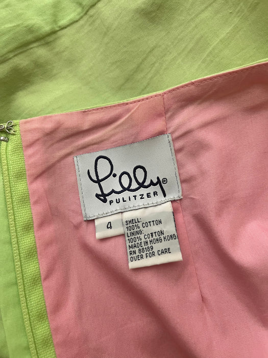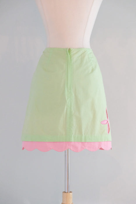 Cute 1990's pink and green skirt by Lilly Pulitzer. Double layered a-line style skirt. Minty green top layer with cherry and floral cutouts revealing the baby pink underneath. Scalloped hemline. Zips in the back. Freshly cleaned and ready to wear! Shirt not included.