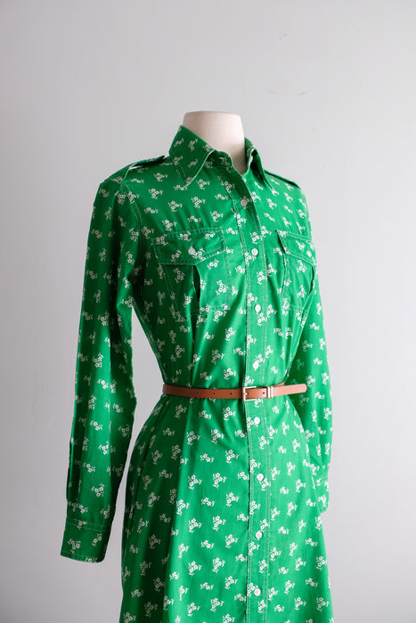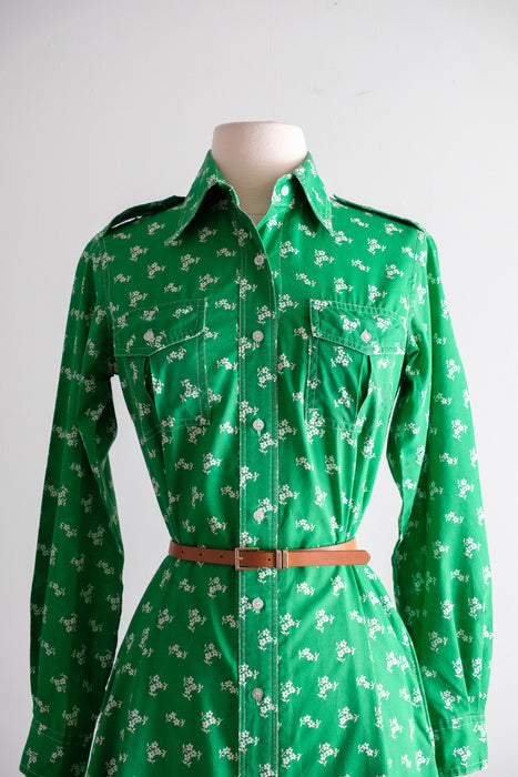 Lovely 1970's Kelly green and ivory floral long sleeved shift dress by Lanz. Cotton shift style dress with long sleeves and epaulettes on the shoulders. Chest pocket in the front and two hidden pockets in the skirt. Buttons down the front. Freshly cleaned and ready to wear! Belt not original but we will include it:)